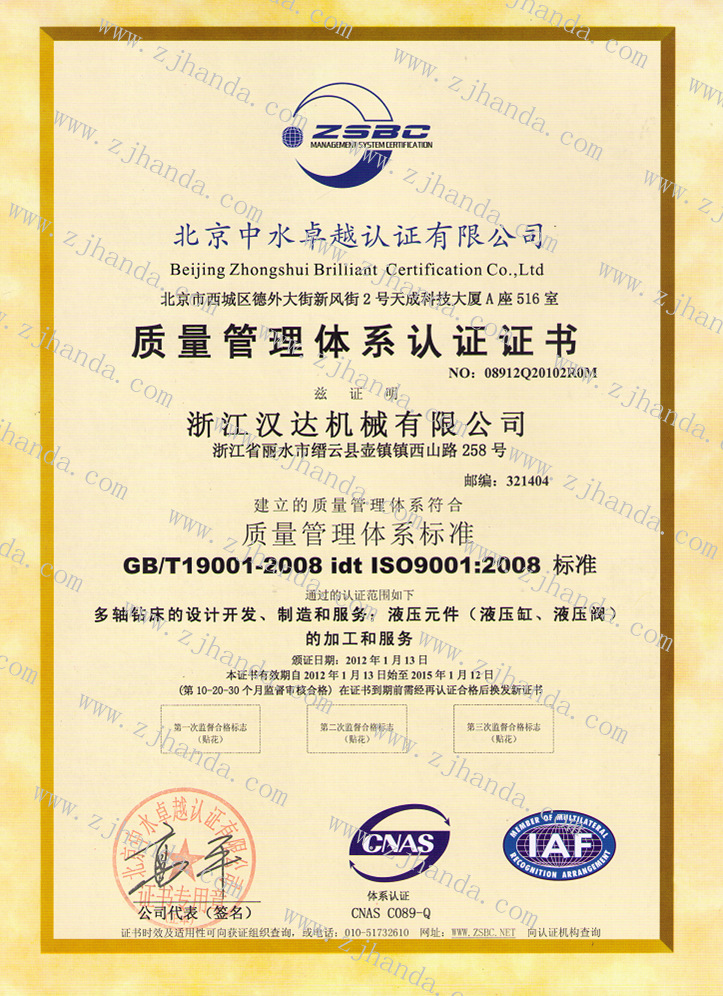 漢達公司通過ISO9000認證,認證范圍包括多軸鉆床、液壓元件